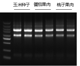 方法:使用多糖多酚植物总RNA提取试剂盒(离心柱型)提取玉米种子、番茄果肉和桃子果肉总RNA,进行琼脂糖凝胶电泳验证。