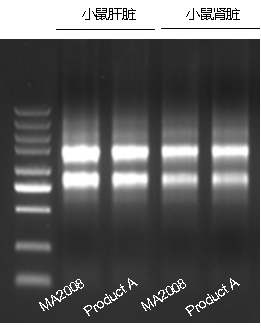 方法:分别使用美仑快速动物组织总RNA提取试剂盒(双离心柱型)及同类竞品Product A,同时提取小鼠肝脏和小鼠肾脏总RNA,进行琼脂糖凝胶电泳验证。
