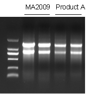 方法:分别使用美仑培养细胞/细菌总RNA提取试剂盒(离心柱型)及同类竞品Product A,同时提取大肠杆菌总RNA,进行琼脂糖凝胶电泳验证。