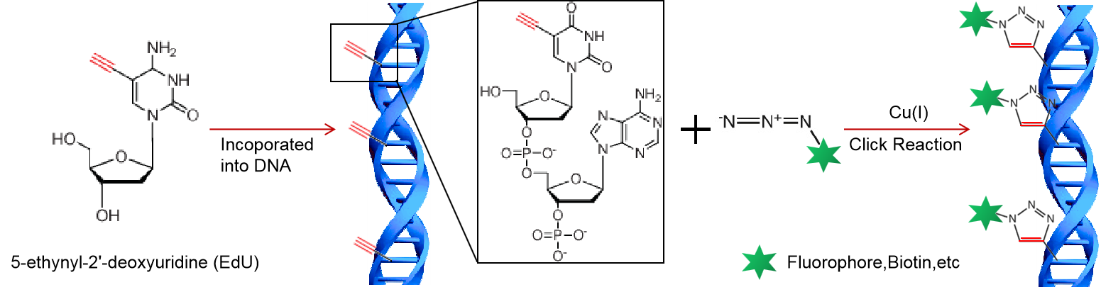 图1. EdU法中的点击反应原理图。掺入到细胞DNA中的EdU与荧光探针或生物素等标记的叠氮化物,在铜离子的催化下发生共价反应,形成稳定的三唑环,使细胞DNA标记上荧光探针或生物素。