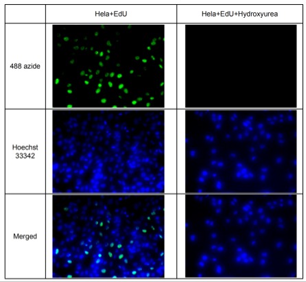 Hela细胞只用EdU标记(左列),或在标记EdU前30min用10mM的DNA合成抑制剂羟基脲(Hydroxyurea)处理(右列),2小时后染色(步骤最后染Hoechst,方便观察增殖细胞比例),然后通过荧光显微镜进行检测。镜下可见,仅EdU标记的细胞有一部分染上绿色荧光的增殖细胞,未增殖细胞的细胞核呈蓝色单染,增殖细胞的细胞核呈绿色和蓝色双染;经过Hydroxyurea处理的细胞,几乎没有呈绿色荧光的增殖细胞,绝大多数细胞核仅呈蓝色。