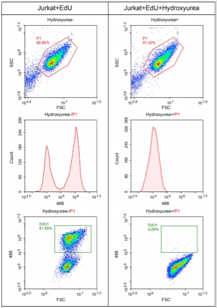 Jurkat细胞只用EdU标记(左列),或在标记EdU前30min用10mM的DNA合成抑制剂羟基脲(Hydroxyurea)处理(右列),2小时后染色,然后通过流式细胞仪进行检测。从流式结果图中可以看出,仅EdU标记的细胞有较高比例的绿色荧光阳性细胞,呈现绿色荧光阴性(弱染色)和阳性(强染色)的两个峰,分别对应于未增殖细胞和增殖细胞。经过Hydroxyurea处理的细胞,绿色荧光阳性的细胞几乎完全消失,仅剩下一个绿色荧光阴性的峰。